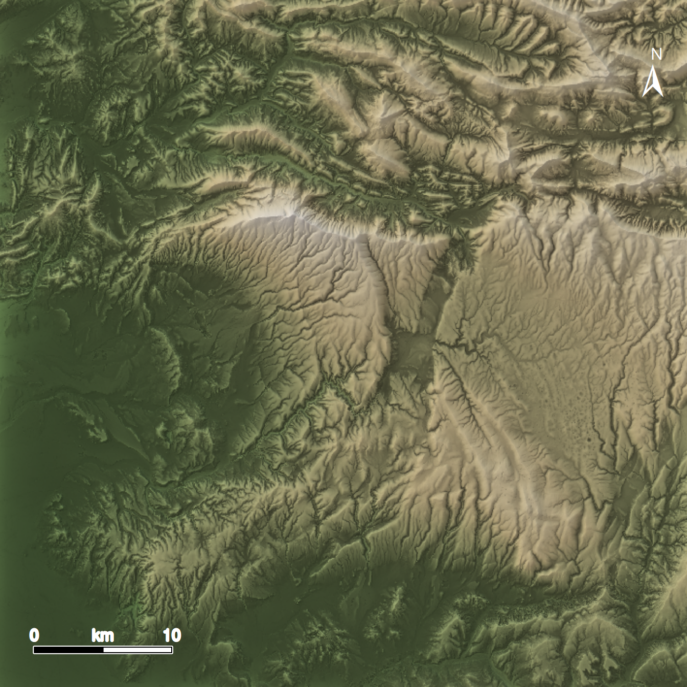 rayshader::add_shadow(tex, max_darken = 0.2)Le résultat de la fonction height_shade() est un array de valeurs RGB. Ce tableau à trois dimensions a les mêmes dimensions et la même résolution que le MNT d’origine, il peut aisément être géoréférencé pour être complété (barre d’échelle, flèche vers le nord…) :