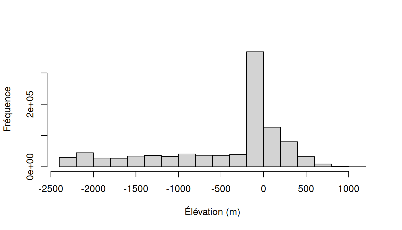 # terra::plot(BDALTI_vrt)Les données du MNT bathymétrique Golfe du Lion – Côte d’Azur sont produites avec une résolution de 0.001° (environ 111 m) et utilisent le système de coordonnées géographiques WGS 84.