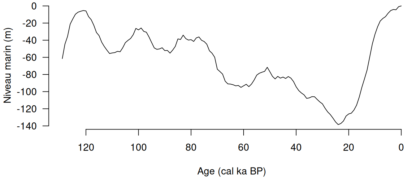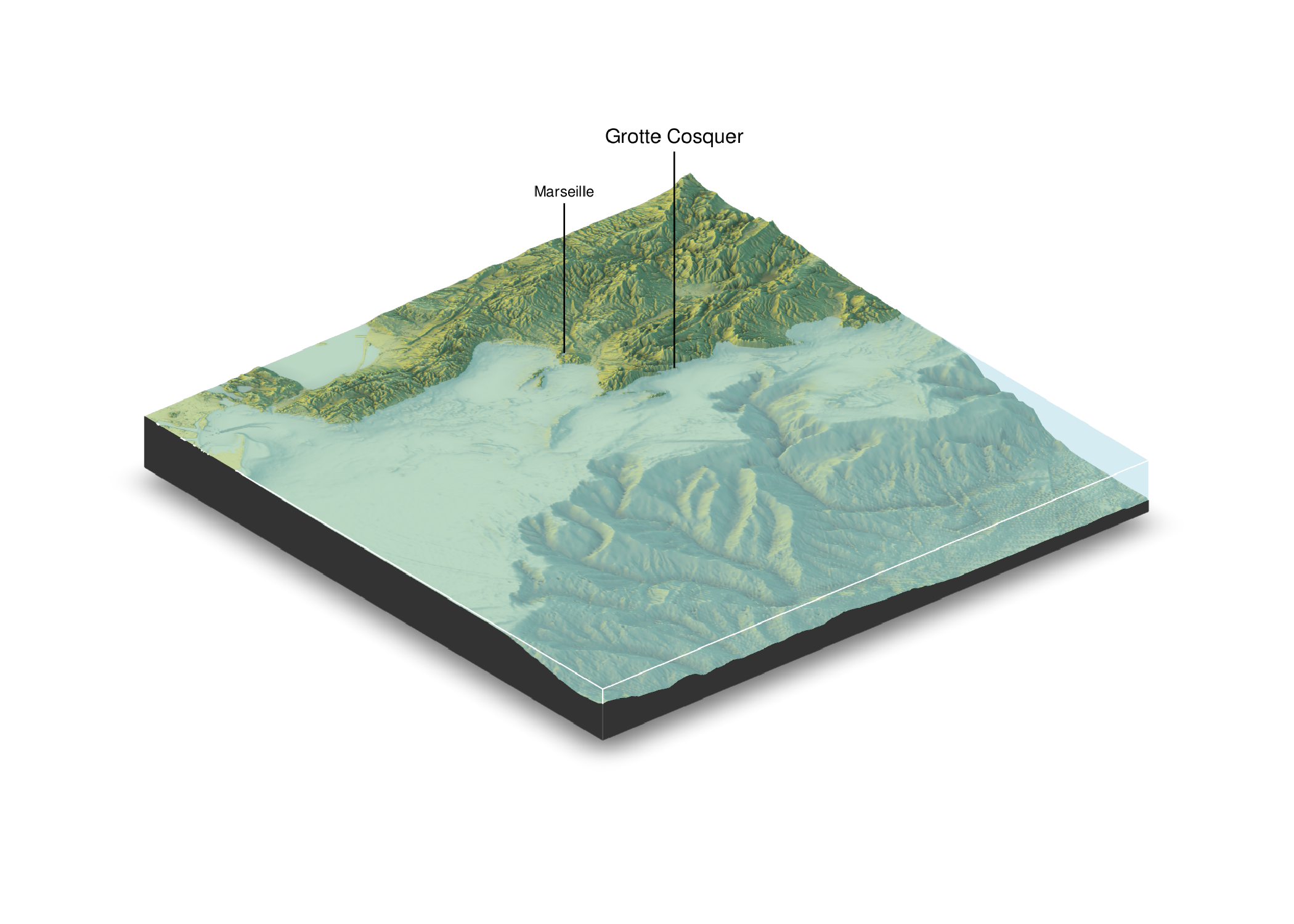 install.packages(pkg[pkg_missing])On cherche ici à produire une vue du littoral de la grotte Cosquer (dont l’entrée est actuellement située à 37 m sous la surface de la mer Méditerranée) et à animer les variations du niveau marin depuis le Pléistocène supérieur. Le tout avec R (R Core Team 2025) et des données libres.