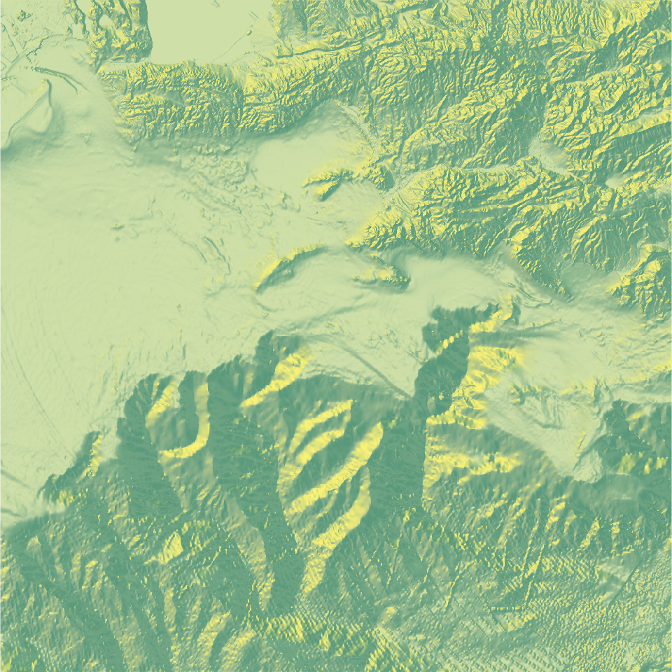 Cette méthode simple de hillshading (dite lambertienne) peut être combinée avec les fonctions ray_shade() qui permet de calculer les ombrage par ray tracing et ambient_shade() qui permet de calculer les ombres liées à la diffusion de la lumière par l’atmophère3.
