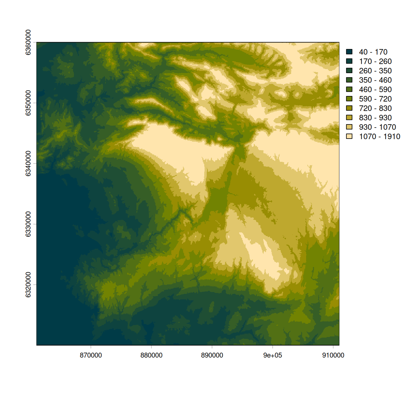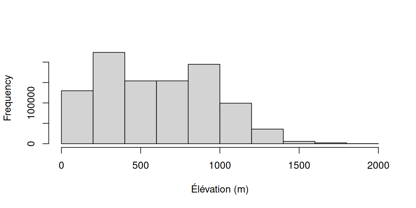 Pour visualiser les données d’élévation, il peut être préférable de les discrétiser : les regrouper selon différents intervalles. Pour réaliser ce découpage, il est utile de commencer par explorer la distribution des données à l’aide d’un histogramme (l’argument breaks de la fonction hist() permet de spécifier le nombre de classes souhaitées) :