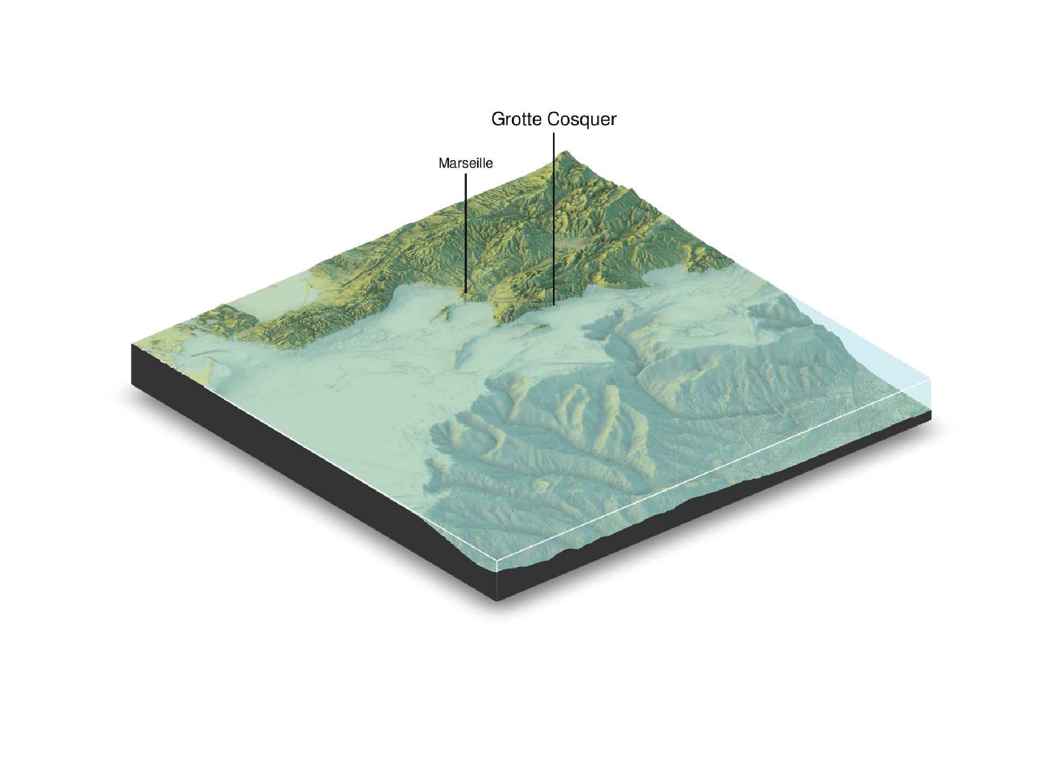 install.packages(pkg[pkg_missing])On cherche ici à produire une vue du littoral de la grotte Cosquer (dont l’entrée est actuellement située à 37 m sous la surface de la mer Méditerranée) et à animer les variations du niveau marin depuis le Pléistocène supérieur. Le tout avec R et des données libres.
