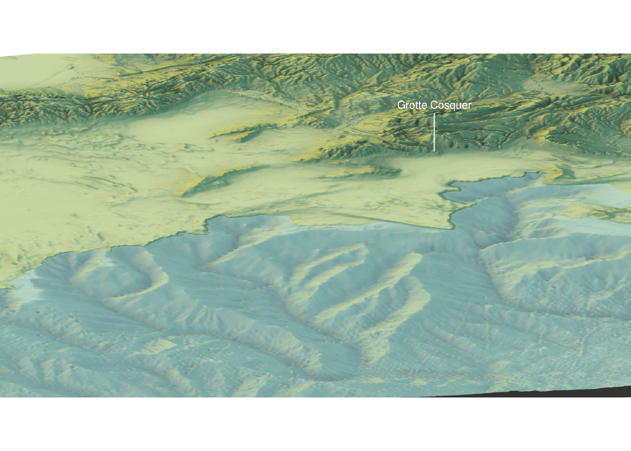 system("ffmpeg -framerate 10 -i ./tmp/render%d.png -pix_fmt yuv420p cosquer.mp4")Cette animation est uniquement illustrative. Elle suppose que la morphologie du terrain est restée inchangée depuis le Pléistocène supérieur et utilise une estimation globale du niveau marin pour représenter des variations locales.